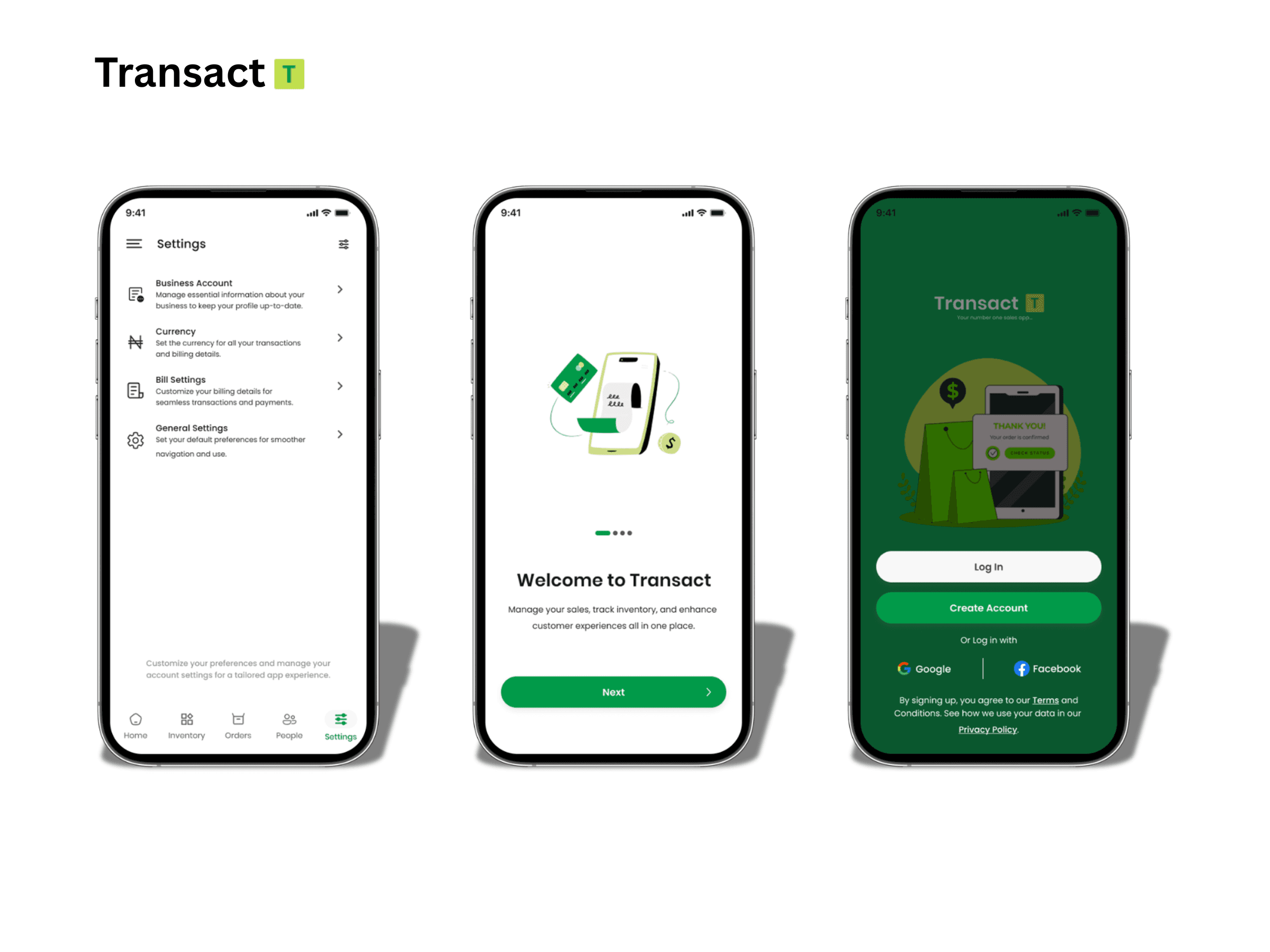 Transact is a B2B SaaS platform designed to help business owners manage transactions, bills, and financial settings through a simple mobile experience.